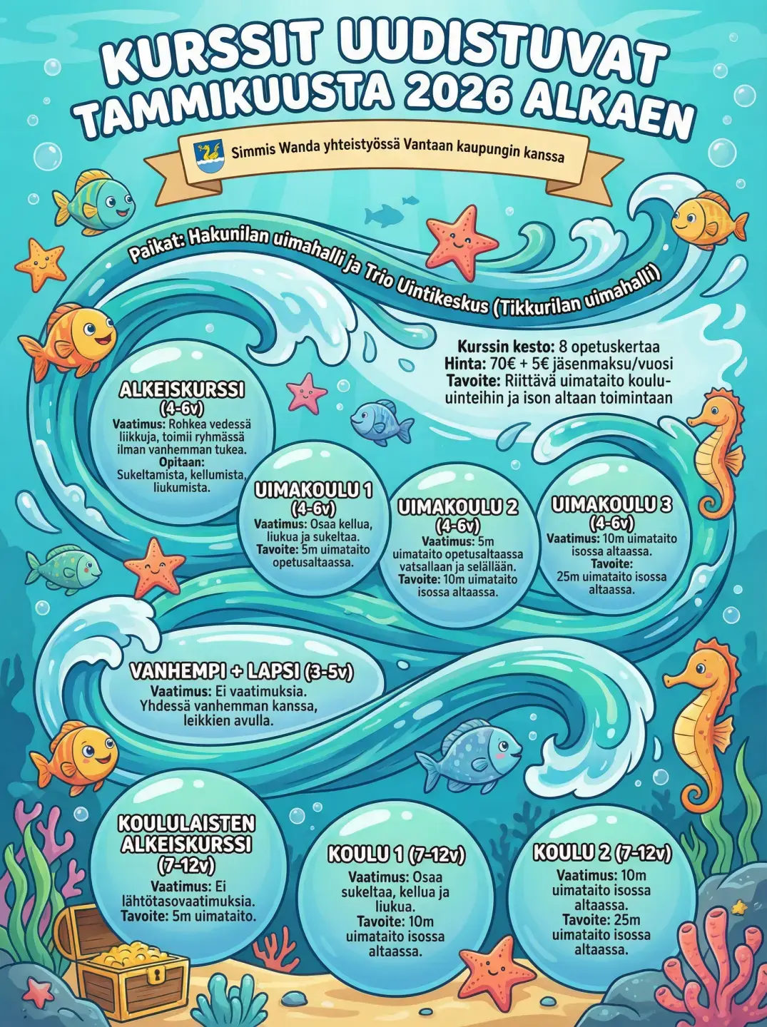 Tavoitteena on, että jokainen alle kouluikäinen saavuttaisi riittävän uimataidon, jotta voi koulu-uinneissa osallistua ison altaan toimintaan. Kurssivalikoimassa on myös kouluikäisille suunnattuja kursseja tukemaan koulu-uintien lisäopetusta tarvitsevia.
